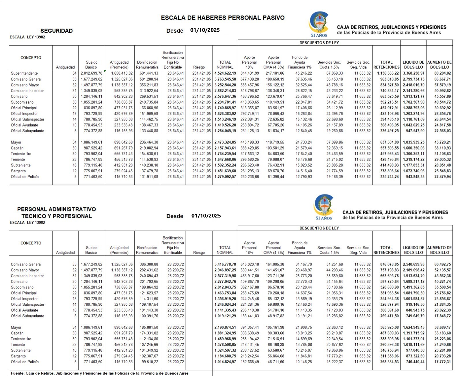 Con los haberes de Noviembre, que se percibirán el 2do. día hábil de diciembre 2025, la Caja de Retiros, Jubilaciones y Pensiones de las Policías de la Provincia de Buenos Aires hará efectiva la escala de haberes pautada para Octubre 2025 por el Gobierno Provincial para el personal de las Policías de la Provincia de Buenos Aires.