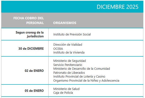 De acuerdo al cronograma oficial de la Tesorería General de la Provincia el pago del mes de Diciembre para los beneficiarios de la Caja de Policía será el 5 de enero 2026.